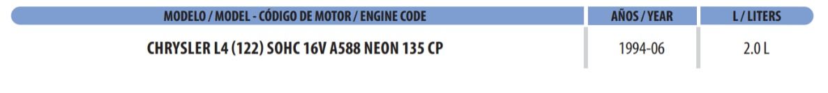 | Chrysler | Neon | Conveniencia | 2.0 L 1996 4 ECC DOHC 16 | 1995 |