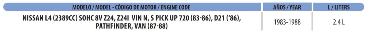 | Nissan | D21 | E | 2.4 L 2389 4 Z24 SOHC 8 | 1988 |