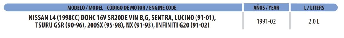 | INFINITI | G20 | T | 2.0 L 1998 4 SR20DE DOHC 16 | 1994 |
