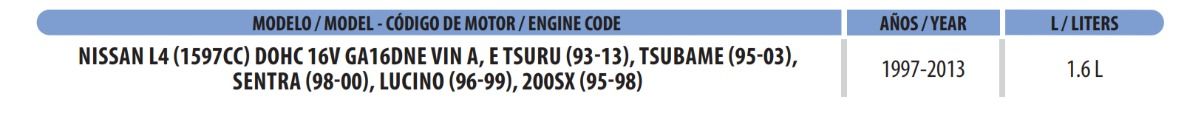 | Nissan | Tsuru | GS I | 1.6 L 1597 4 GA16DNE DOHC 16 | 2016 |